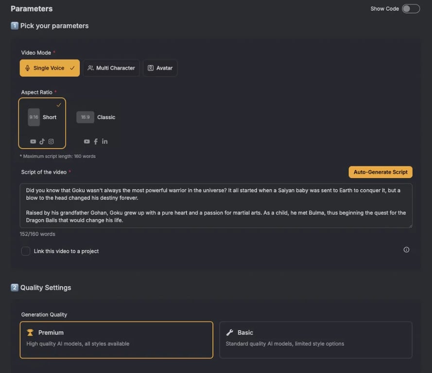 Step 4: Choose the video quality For Dragon Ball content, we recommend the "Premium" option, as it guarantees maximum quality anime-style images. The additional cost for voice quality is insignificant compared to the epic final result.