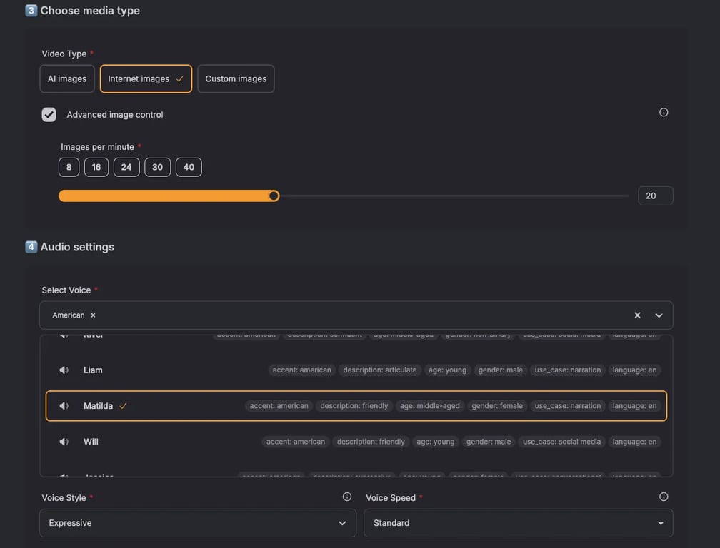 Step 6: Choose the voice You have access to a wide catalog of voices. For travel videos, a voice like "Matilda" can be an excellent choice. The final selection will depend on your audience and language.