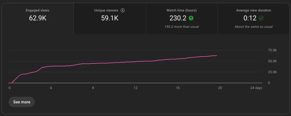 Sorprendentemente, el 63% de los Shorts alcanzan su momento estelar entre los días 14 y 28. Mantén tu estrategia constante durante al menos 45 días antes de cambiar alguna variable.